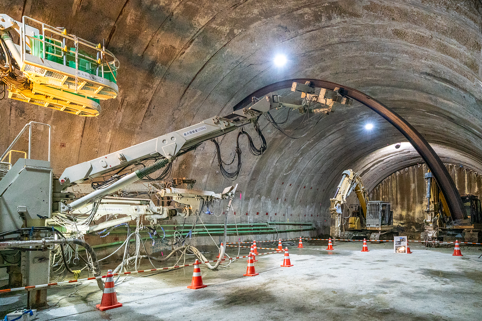 アーチ状の支保工(鋼材)を設置し、コンクリートを吹き付けることで地山の崩壊や変形を防ぎます。