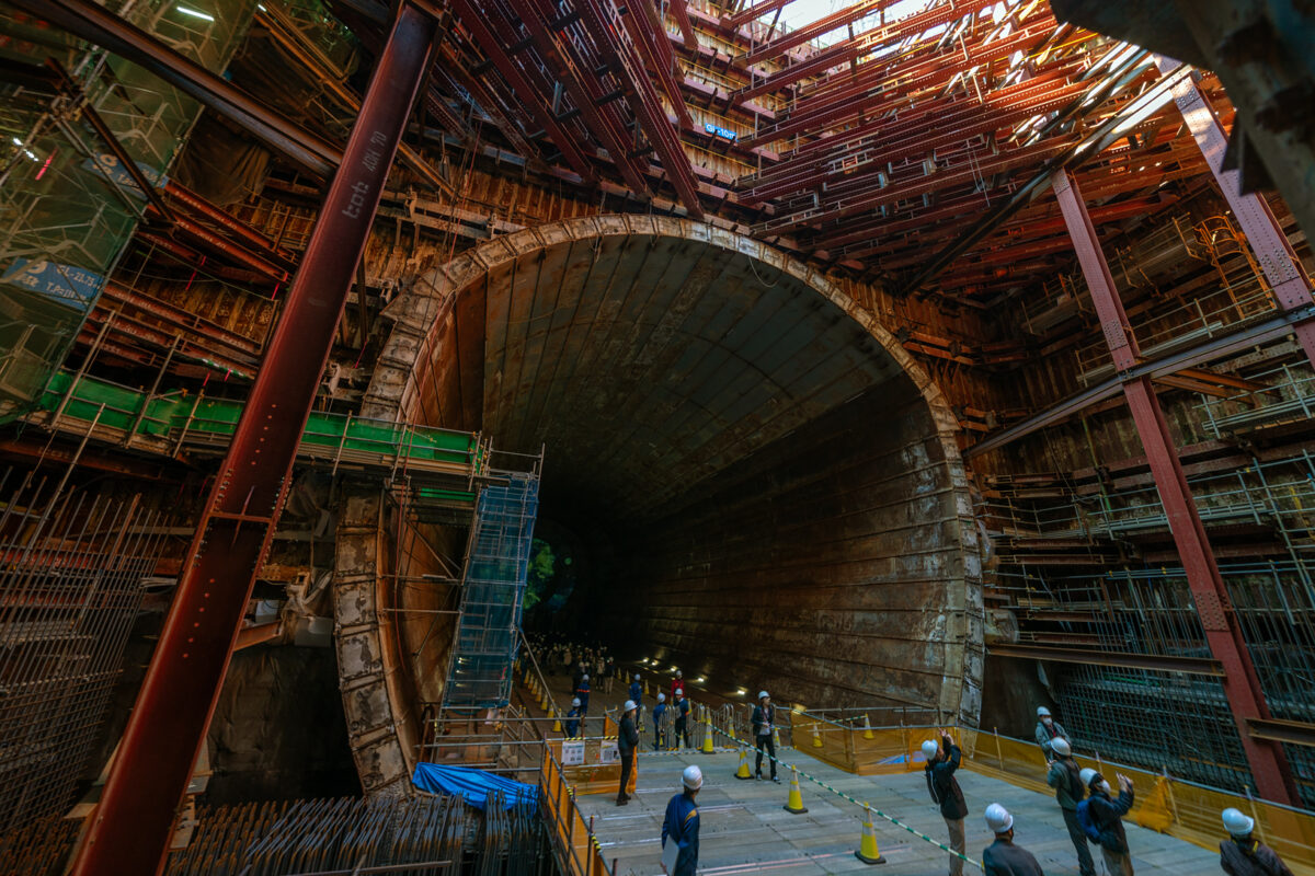 立坑の地下では、第二首都圏トンネルを掘削するシールド機の組み立てが進んでいます。現在は土を削るカッターヘッドの組み立てを終えました。