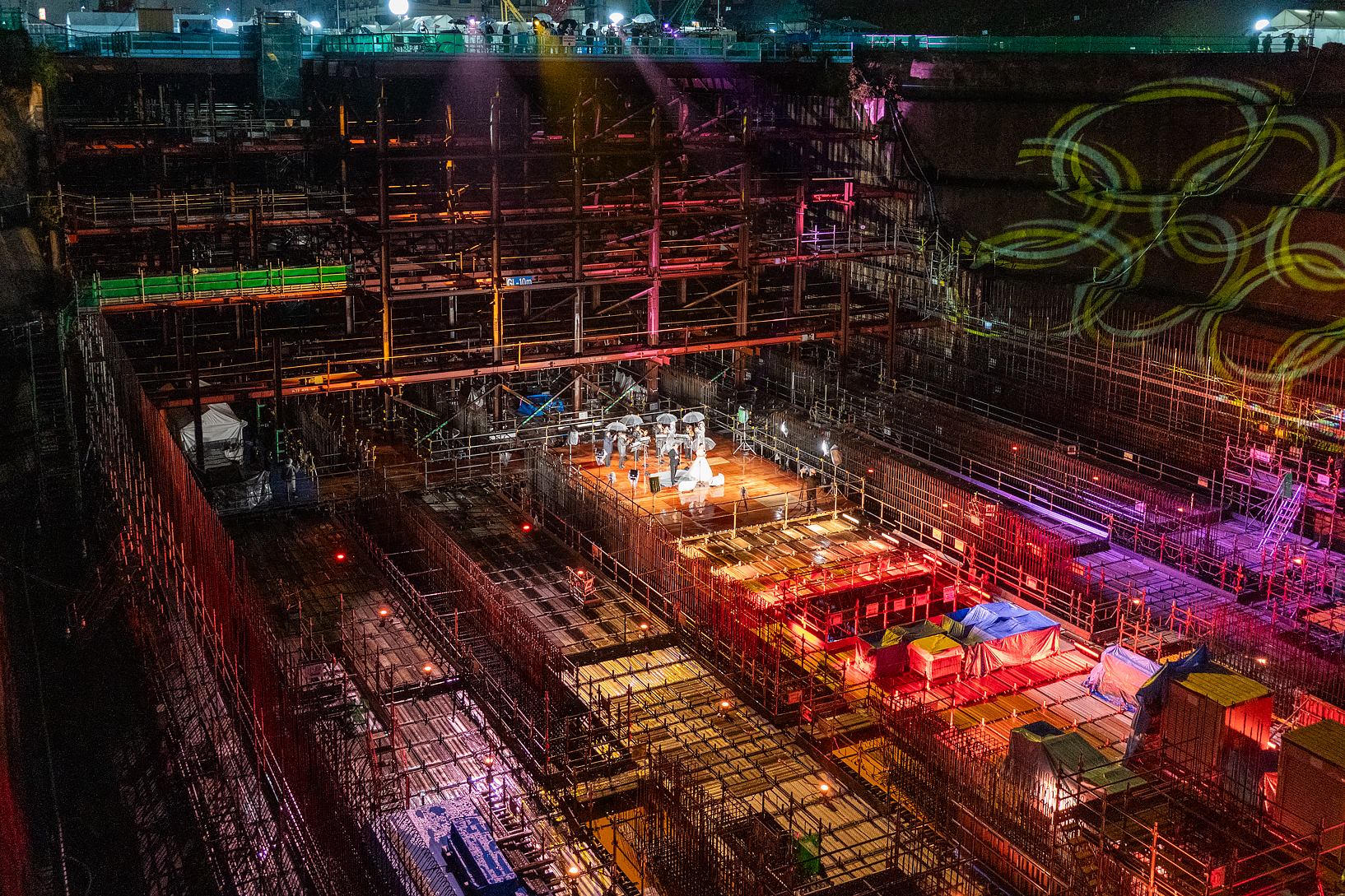 18時になると、地下工事現場内の特設ステージで「地下交響(ちかこうきょう)〜Echoes of The Earth」が開演。神奈川ゆかりのオペラ歌手2名とトロンボーン奏者4名がJR東海のテーマソング「会いにいこう」などを奏で、神奈川県駅の地下空間に荘厳な響きを満たしました。