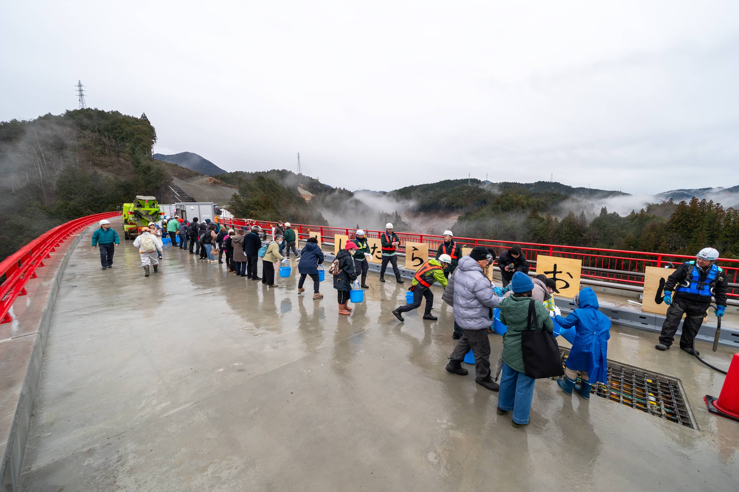 愛知県を拠点に活動する和太鼓 夏椿による演奏とともに「打設バケツリレー」が始まりました。橋が連結する最後の打設を、参加者によるバケツリレーで完了させます。
